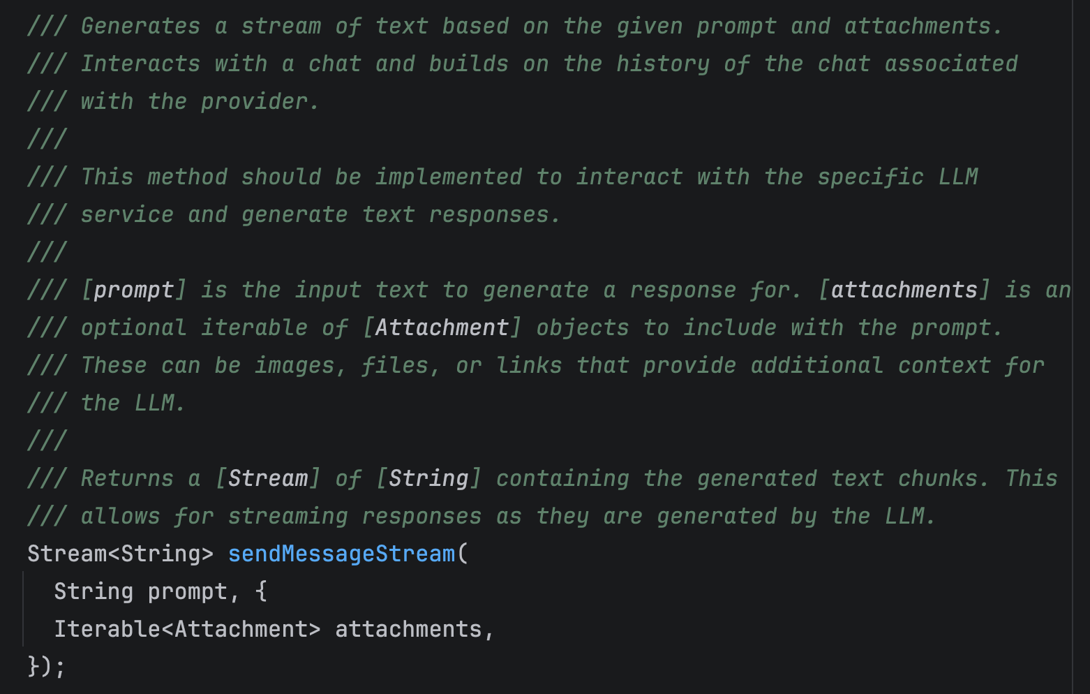 One of the key methods you need to implement inside LlmProvider is sendMessageStream. Even though the documentation describes it quite briefly, this is actually the core of the entire interaction flow.